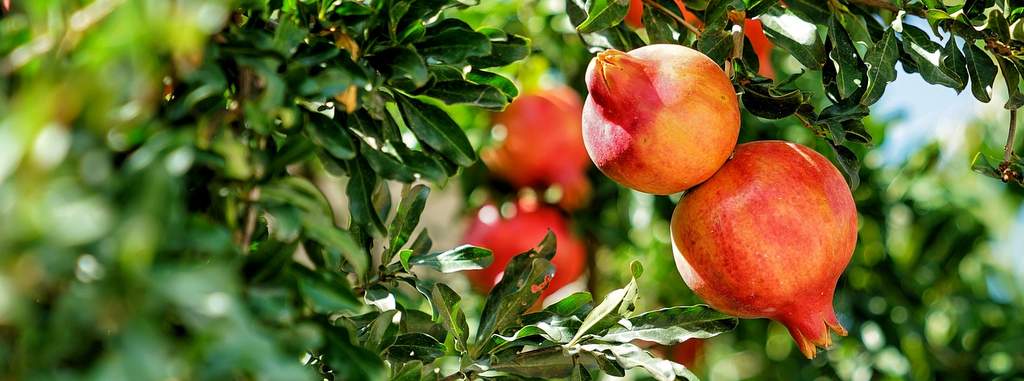 Der Granatapfel, ein sommergrüner Strauch oder Baum gehört zu den Weiderichgewächsen. Der Baum kann bis zu 5 m hoch werden. Die vierkantigen Zweige enden oft dornig. Die gestielten Blätter erscheinen auf der Oberseite dunkelgrün ledrig glänzend und wachsartig überzogen. Sie sind gegenständig und des Öfteren in Wirteln angeordnet. Es überwiegt ihre lanzettliche Form. Die geruchlosen, zwittrigen Einzelblüten (enthalten weibliche und männliche Organe) bilden zartgelbe bis orangerote Blätter aus. Interessant sind die ca. 150–200 g schweren apfelähnlichen Früchte, die als ledrige Beeren (Balausta) bezeichnet werden. Die Samen sind, umgeben von einer saftigen, herbsüßen Schale, in Kammern gelagert. Eine Frucht enthält ca. 200‑1000 Samen. Der Granatapfel bevorzugt sandigen und fruchtbaren Boden, hohe Temperaturen und wenig Niederschlag, ist kurzzeitig frostresistent. Die seit Jahrtausenden kultivierte Pflanze findet man heute z.B. in folgenden Gebieten: Türkei, Kaukasus, Iran, Afghanistan, Pakistan, China, Mittelmeerraum, Südafrika, Chile, Naher Osten.